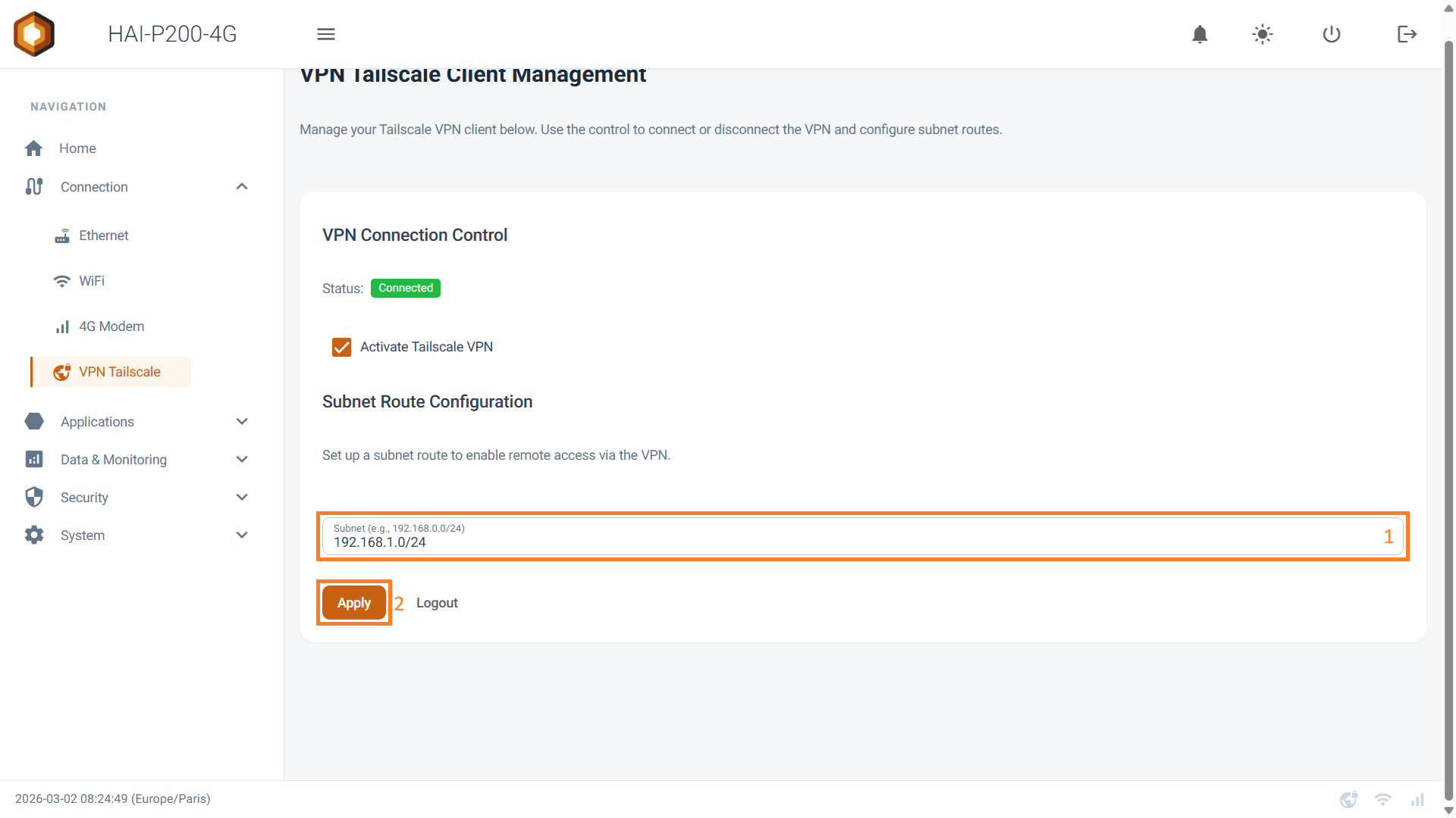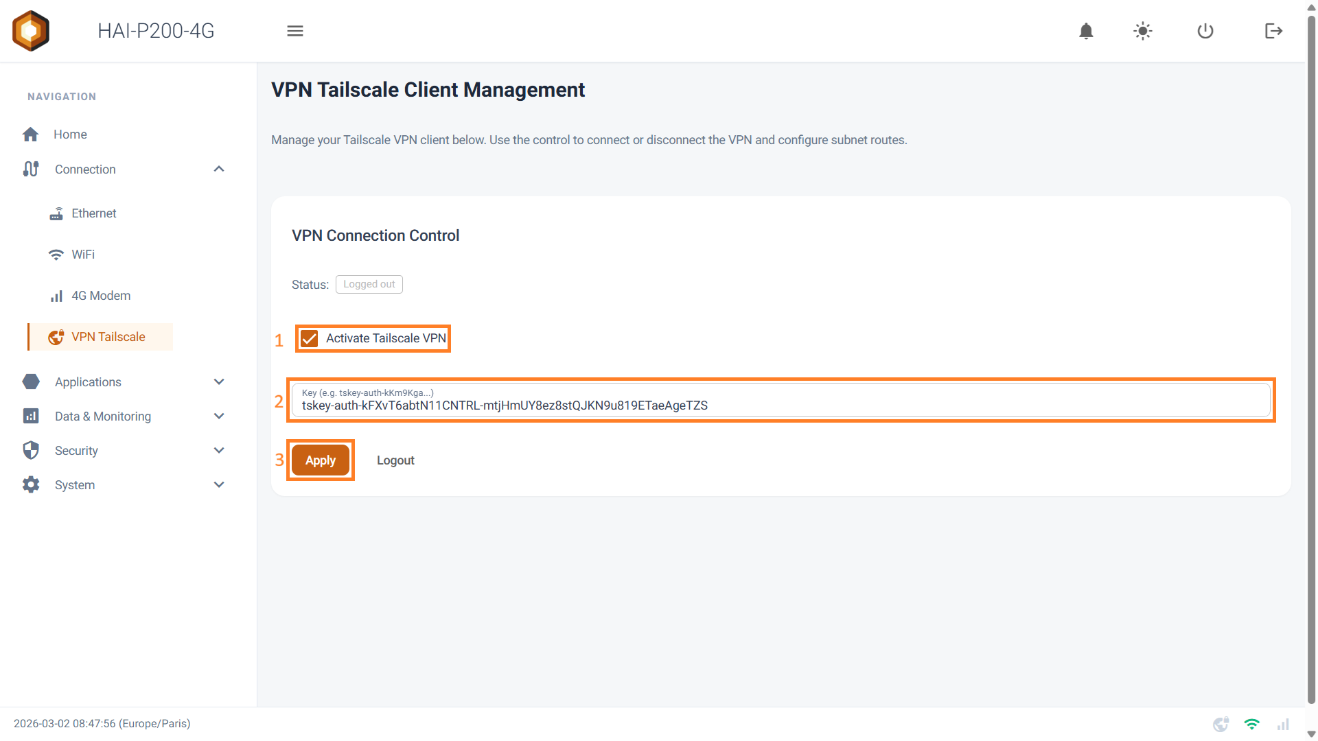 Cette clé peut être copiée. Vous pouvez alors vous rendre sur l’interface web de votre passerelle HAI-P200-4G. Cliquez sur VPN Tailscale et renseignez votre clé dans la zone de texte. Cochez Activate Tailscale VPN et cliquez sur Apply.