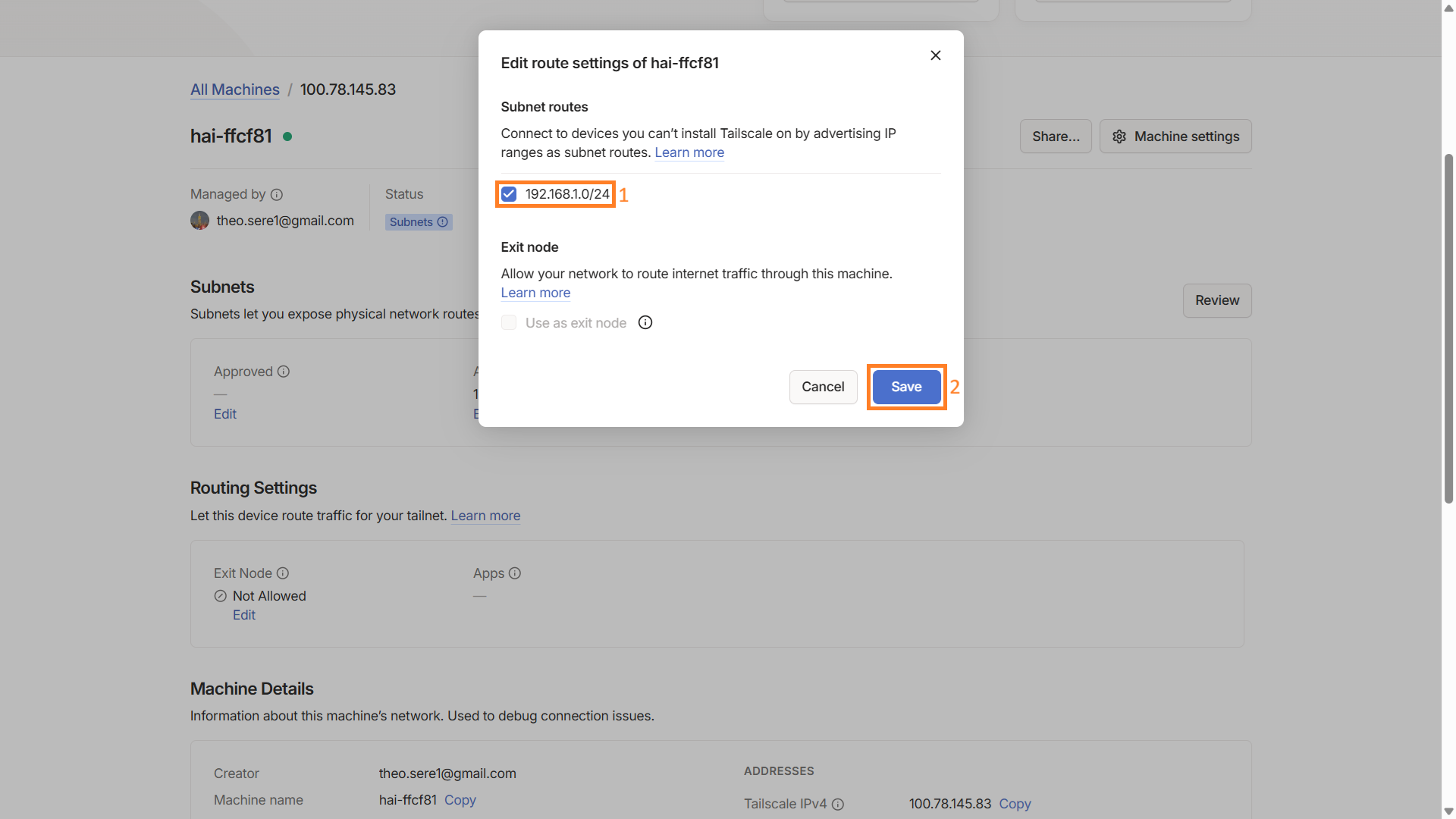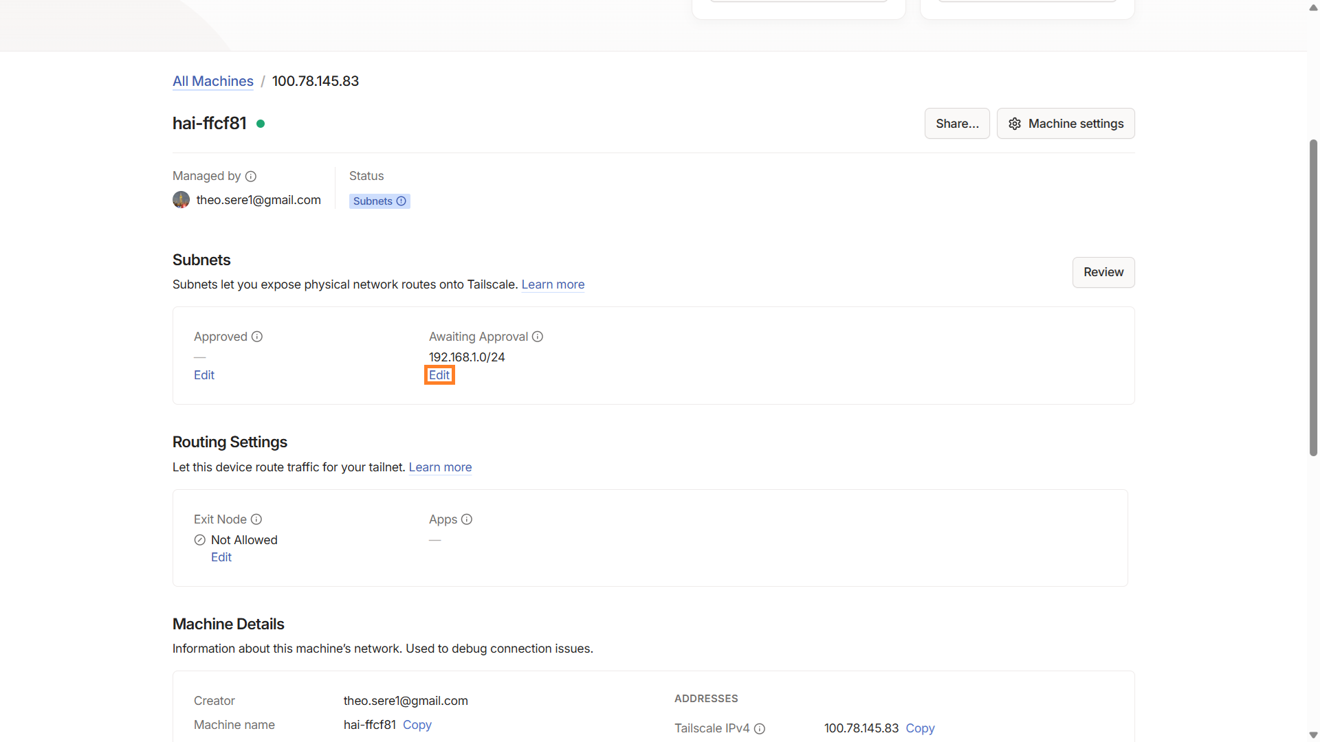 Une fois validé, vous pouvez vous rendre sur l’interface d’administration de Tailscale, sur leur site, et cliquer sur le nom de votre passerelle.